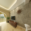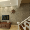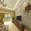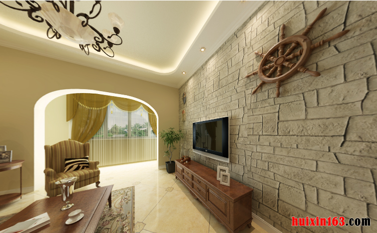 在客厅的电视背景墙上采用具有立体视觉感受的壁纸打造出一个斑驳的墙面,在上面悬挂一个轮船的方向盘,让空间看起来更加的淳朴自然。阳台和客厅之间由一个宽大的拱门连接,搭配条纹的简欧风格的沙发,以及优雅的窗帘,让整体空间变得优雅高估起来,原始与现代的冲突表达出强烈的视觉效果。
