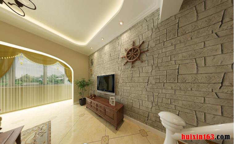 在客厅的电视背景墙上采用具有立体视觉感受的壁纸打造出一个斑驳的墙面,在上面悬挂一个轮船的方向盘,让空间看起来更加的淳朴自然。阳台和客厅之间由一个宽大的拱门连接,搭配条纹的简欧风格的沙发,以及优雅的窗帘,让整体空间变得优雅高估起来,原始与现代的冲突表达出强烈的视觉效果。