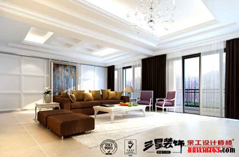 本套为混搭风格装修,客厅地面采用的是大理石装修,局部采用的是白色的地毯进行装饰,墙面采用的是白色的乳胶漆进行装修,吊顶采用石膏板进行平顶吊顶,加以水晶灯做装饰,客厅又明亮又温馨,客厅正中间摆放了一个白色的茶几,茶几的对面是一个沙发,沙发的左面是棕色的座椅,右面是紫色的座椅,中间一个与众不同的沙发,这个沙发可以当床用,客厅整体显得十分大方、高雅。