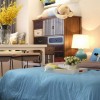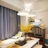 本案例采用的是田园风的装修风格,整个空间的设计大量的留白处理,展现出一个惬意舒适的居室环境,在客厅的布置当中,采用平顶式的石膏板吊顶,搭配上两盏个性的吊灯,空间五颜六色的色彩搭配,让居室不显得单调乏味,实木铺设的地毯,鲜明的色彩反差,与吊顶上下相互呼应,客厅所占据的空间面积并不是很大,但却显得比较自然舒适,个性的电视柜设计,一旁就是一个小书柜的设计,装饰空间的同时,也增加了空间的收纳功能,落地窗的设计搭配上轻质的窗帘,让狭窄的空间显得更加的明亮透彻,餐厅的设计也比较个性,不管是造型设计还是色彩搭配都比较新颖。