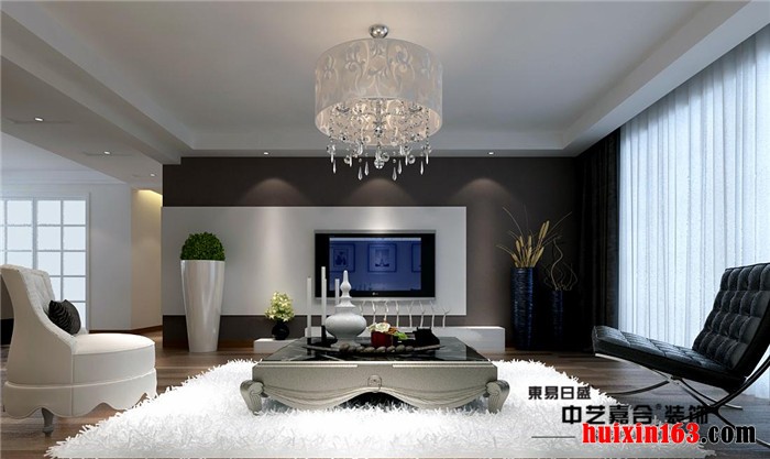 极简的几何直线打造的客厅吊顶,简明利落且具有层次感,圆形镂空雕花灯罩水晶吸顶灯装饰,为吊顶赋予了新的美感。不对称造型设计的电视背景墙,黑灰色墙纸搭配白色造型,鲜明且强烈的色彩对比,光与影的交相辉映,是电视背景墙成为整个家居空间的突出点。深色强化木地板铺地,与墙面白色部分及吊顶形成对比,不会给人头重脚轻的感觉,且突出空间的层次感,空间比例设计合理,色调比例和谐,深浅有度,沉稳而不失明快。白色长毛地毯,质地柔软,脚感舒适,以简欧风格茶几及家具代替现代简约家具,设计合理有创新,给人耳目一新的感觉,与周围现代简约风格环境结合的十分恰当,一点都不会给人突兀的感觉。色彩的运用上同样采用强烈的色彩对比手法搭配设计,与家居整体色调相吻合。
