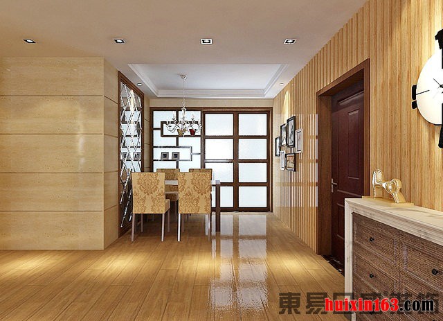 饰面板结合茶色镜打造的电视背景墙,朴素且时尚,传统中带着现代,设计简洁明快,简约却并不简单。几何直线打造的客厅吊顶,看上去干净利落且富有层次感,水晶珠帘吸顶灯搭配,有画龙点睛之妙。树木丛生的墙纸装饰沙发背景墙,给人回归自然的清新感,黑色画框的装饰画点缀,以突出画的立体感。实木地板铺地,脚踩在上面可以感受到实木感,花纹地毯过渡,低矮的方形茶几,造型简约却很实用。浅色花纹布艺转角沙发,暗紫色靠背与周围浅色的格调形成对比,突出沙发立体的同时也使得色彩得以平衡,整个家居设计给人温馨舒适、自然休闲之感。