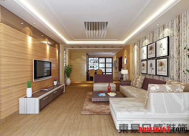 饰面板结合茶色镜打造的电视背景墙,朴素且时尚,传统中带着现代,设计简洁明快,简约却并不简单。几何直线打造的客厅吊顶,看上去干净利落且富有层次感,水晶珠帘吸顶灯搭配,有画龙点睛之妙。树木丛生的墙纸装饰沙发背景墙,给人回归自然的清新感,黑色画框的装饰画点缀,以突出画的立体感。实木地板铺地,脚踩在上面可以感受到实木感,花纹地毯过渡,低矮的方形茶几,造型简约却很实用。浅色花纹布艺转角沙发,暗紫色靠背与周围浅色的格调形成对比,突出沙发立体的同时也使得色彩得以平衡,整个家居设计给人温馨舒适、自然休闲之感。